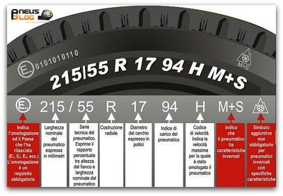 Le caratteristiche dello pneumatico, identificate da numeri e lettere, sono riportare sul fianco. Con la vendita degli pneumatici è indispensabile, per la sicurezza del veicolo, controllare la corrispondenza tra le sigle dello pneumatico e quelle contenute nella carta di circolazione.